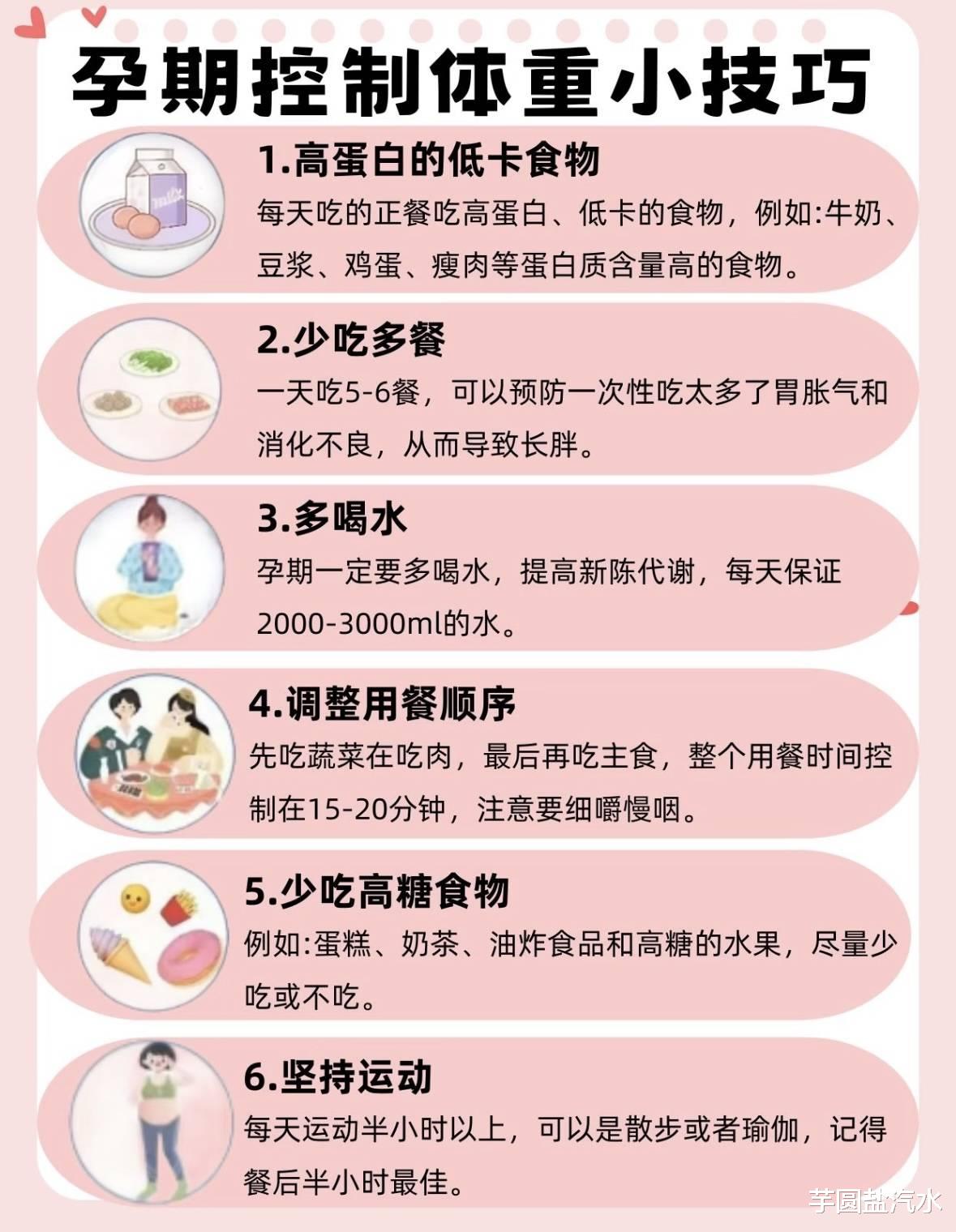 “0-3月不饿不胀,4-7月不饿不胀,8-产月不饿不胀;0.5kg/周,1.2g/kg蛋白,25g纤维,150min运动,今天照做,今晚少饿!”把口诀贴冰箱,今天照做,今晚少饿,孕妈少饿,宝宝少重!