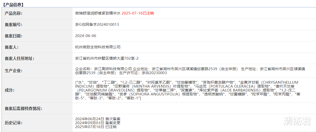 目前微瑞舒在小红书共推出了3款产品,微瑞舒薄荷雾电子口腔喷雾、微瑞舒虫草纳豆发酵精华和微瑞舒滢润舒缓紧致精华水。其中,微瑞舒滢润舒缓紧致精华水网页显示的备案编号为“浙G妆网备字2024010013”,通过药监局官网查询发现,该产品于2024年6月6日,由杭州微致生物科技有限公司备案,由江高妍科技有限公司生产,但在2025年7月6日已经注销。