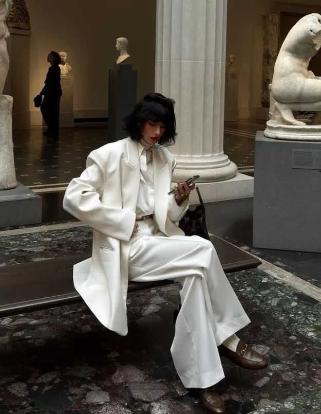 ins博主veneti.a的穿搭风格叠搭利落有层次,留着短发穿着西装的她精致飒美,用西装穿出了老钱帮派的霸气。