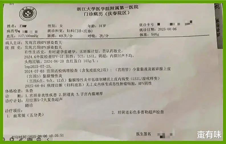 但压垮骆驼的最后一根稻草,是健康问题。两人关系混乱,导致王某身体发出警报,后来在浙江大学医学院附属医院的检查单显示,她感染了HPV-51型病毒!这是一种高危型病毒,与宫颈癌密切相关。
