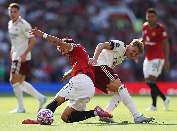 出人意料的是,卡塞米罗和B费的双后腰组合踢得还真不错,没有给阿森纳太多机会。