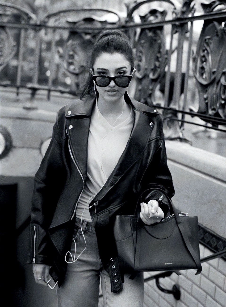 黑色机车夹克,雷朋墨镜,蓝色牛仔裤,高高梳起的马尾辫,那白色的耳机与棕色的包包,怎么看都是为时尚刻意加入的成分。