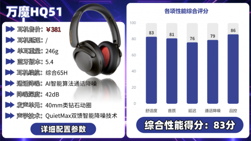 头戴蓝牙耳机哪个品牌音质好?作为一款综合性耳机,这款耳机采用蓝牙5.3方案,连接迅速抗干扰能力强;约246g的重量与柔软耳罩确保了长时间使用的舒适度,头梁和耳罩均可调节以适应不同用户。其主动降噪系统(38dB) 能削弱大部分中低频环境噪音,并支持环境声模式,不过对尖锐人声等的隔绝效果有提升空间。音质上,40mm定制大喇叭奠定了良好基础,声音清晰耐听,低频有力,但仅支持SBC和AAC编解码。续航方面,关闭降噪后续航80小时,开启降噪则为70小时,并支持USB-C充电。它保留了3.5mm有线接口,并支持折叠收纳。主要不足包括不支持多设备无缝切换,蓝牙版本非最新,以及机身塑料感明显,频繁折叠时需注意转轴结构强度。