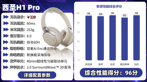 西圣H1Pro虽然平价,它的配置却能直接对标中高端型号,拥有最新蓝牙6.0音频芯片,耳机端延迟低至60ms、60小时续航、Enc通话降、智能一拖二等旗舰配置于一身,两百多的价位能有这种配置,难怪数码博主都夸它是“性价比之王”。