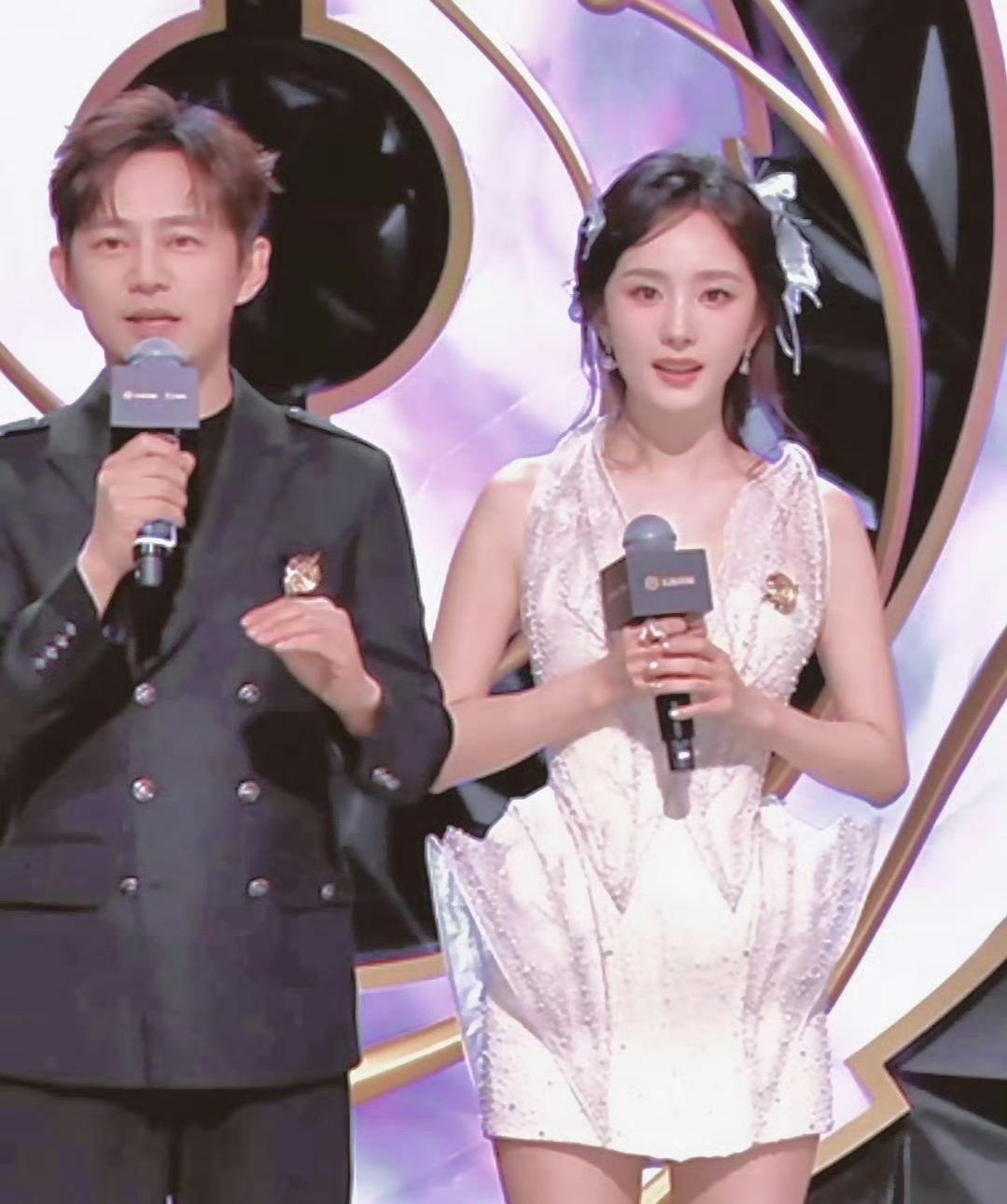 就在她踏上舞台时,站在侧方的何炅突然抬手,用一贯温和却带着点调侃的语气喊道:“幂幂,你话筒拿了吗?”这句话像一颗小石子投入平静湖面,瞬间激起涟漪。杨幂脚步一顿,低头看了看空荡荡的双手,眼睛瞬间瞪圆,脱口而出:“哎呀忘了!”随即转身小跑回后台,露出几分孩童般的慌乱。这一幕被现场镜头捕捉,迅速在社交平台引发热议。