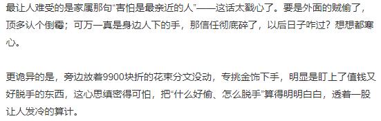 - “外人哪会这么‘讲究’?定是知道她住院家里没人,连贵重物品放哪儿都门儿清!”