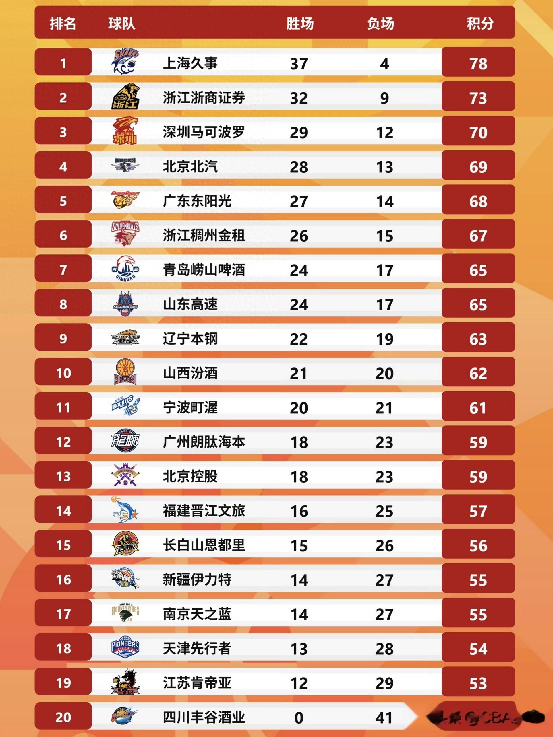 积分榜往下,广东东阳光已经确定第五名,浙江稠州金租稳居第六名。两支球队都要打季后赛的附加赛,虽然没有轮空优势,但整体实力在附加赛阶段占据优势。尤其是,广东队季后赛经验和阵容深度的优势明显,打进八强问题不大,也是本赛季争冠的热门球队之一。