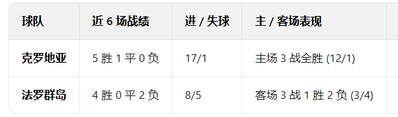 关键差异:克罗地亚攻防均衡(17球仅失1),法罗群岛虽有爆冷能力,但整体实力差距悬殊。