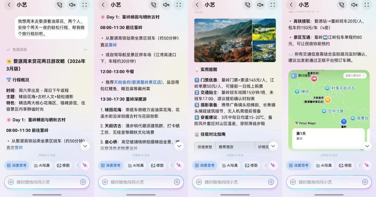 想要来一场说走就走的旅行,其实你只需要一个懂你的“旅行管家”。长按手机电源键唤醒小艺,直接对TA说出你的想法:“我想周末去婺源看油菜花,两个人,安排个两天一夜的轻松行程,帮我做个旅行规划吧。”