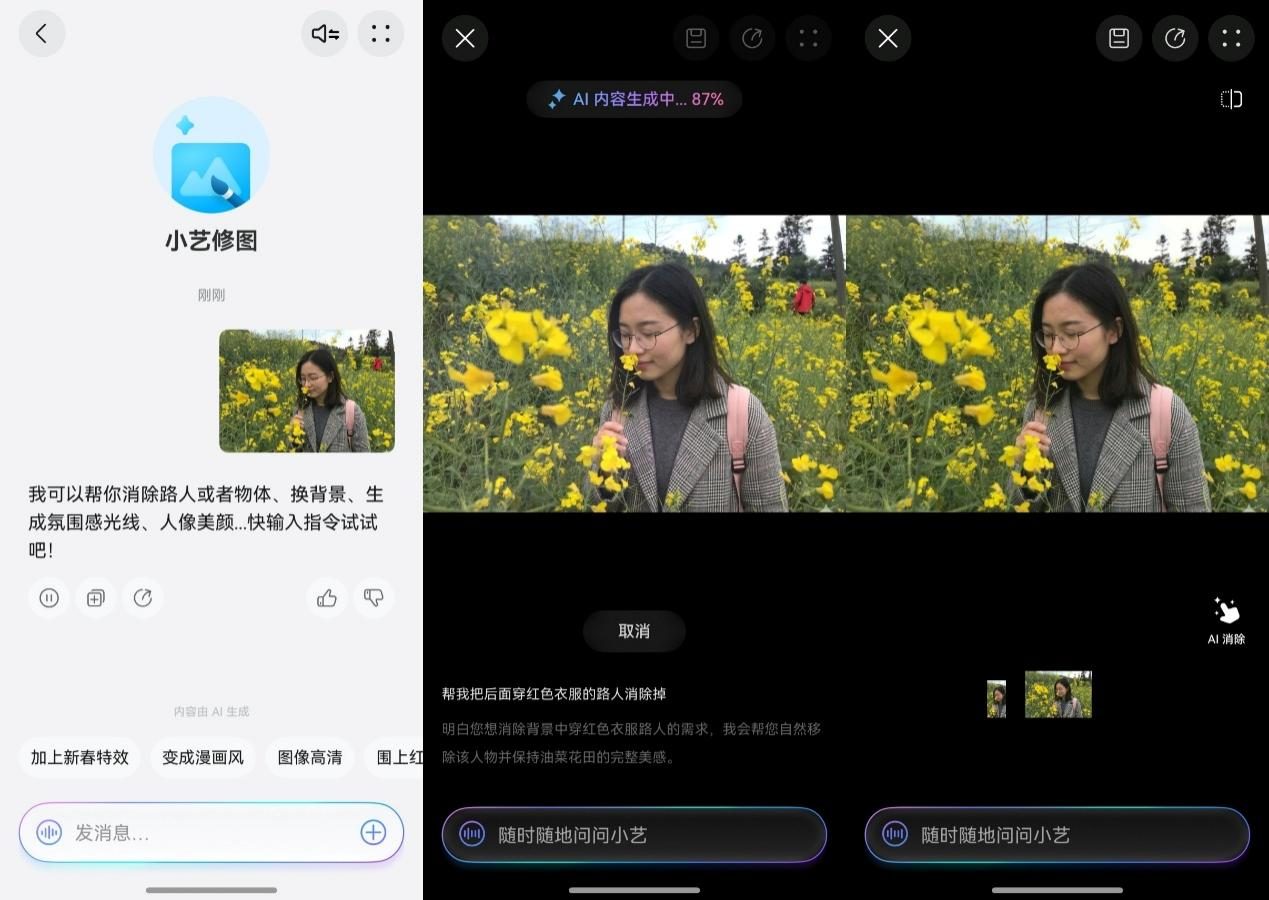 想手动“P掉”路人?稍不留神就会留下生硬的涂抹痕迹。现在,面对不完美的照片,你有了更聪明的解法——直接跟小艺对话。