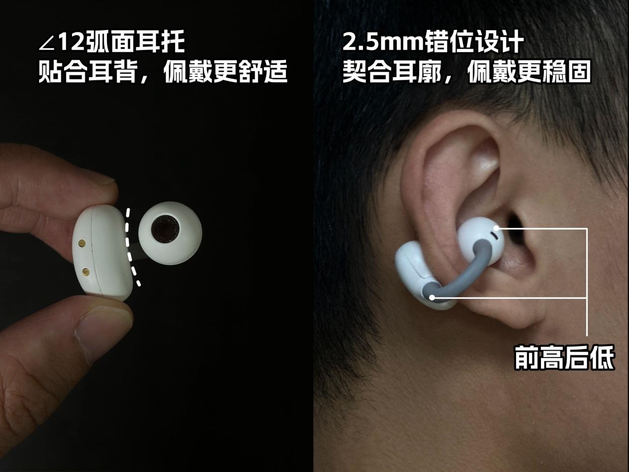 佩戴体验:采用了前高后低的2.5mm 错位设计,能恰好贴合耳朵形状,让佩戴更稳固;电池部分则做成∠12弧面耳托,可完美贴合耳背,进一步提升贴合度与舒适度。单耳仅 4.5g 的重量,佩戴起来不夹耳,几乎无感。