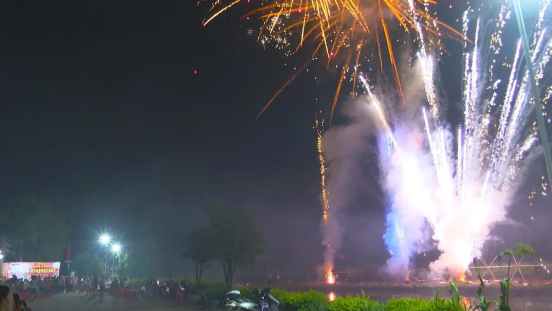 在烟花汇演中,一朵朵多彩的烟花腾空而起,在空中竞相绽放,将新民村的夜空装点得璀璨夺目,村民们纷纷拍照留念,定格双节同庆的精彩瞬间。