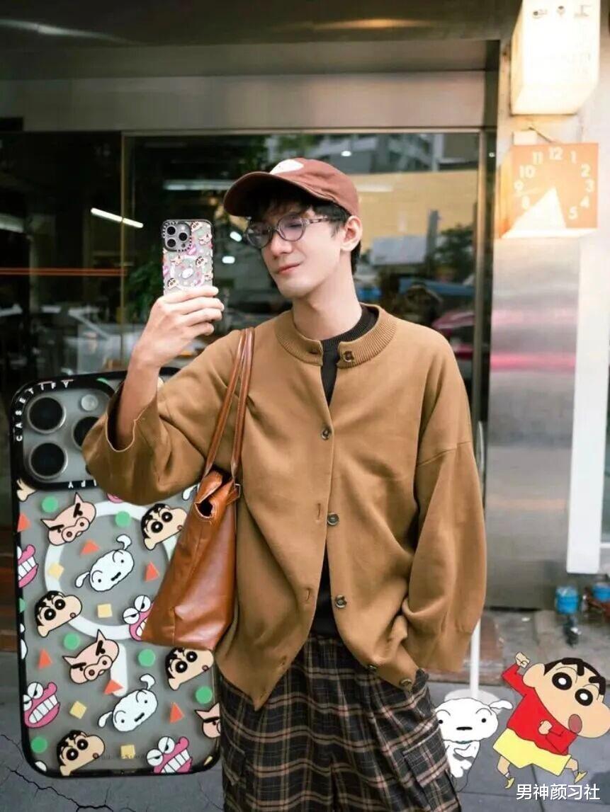卡其色开衫叠穿深色内搭,搭配格纹休闲裤与复古挎包,营造出一种复古英伦调性。层次丰富又不显繁琐,轻轻松松就能穿出书卷气与雅致感。