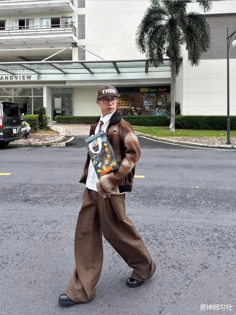 焦糖格纹拼色夹克搭配白衬衫与摩卡色西裤,整体配色温润柔和,既有复古氛围又带着一丝绅士感。这种造型非常适合秋日街头,既温暖又有格调。