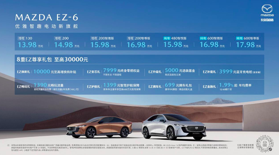 为进一步降低广大用户的拥车门槛,长安马自达此次推出了丰厚的购车权益:自上市之日起,购EZ-6可享8重EZ尊享礼包,至高30,000元:EZ焕新礼:10,000元至高增换购补贴;EZ安芯礼:7,999元终身零燃权益,不限车主,不限里程;EZ升级礼:5,000元选装基金,购买选装包立减;EZ补能礼:3,999元蓝牙充电桩(含安装);EZ畅玩礼:1,390元畅玩流量,基础流量终身免费,娱乐流量2年免费(10G/月);EZ护航礼:1,399元智驾护航保障,新车车主首年享至高600万元智驾保障;EZ拥车礼:699元拥车礼包(豪华TPE脚垫,精品钥匙礼盒);EZ金融礼:1.99%起年均费率,12-60期个贷。详情可咨询长安马自达辽宁旺达店。