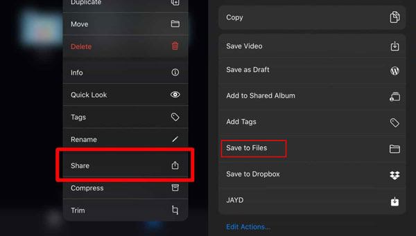 步骤3. 在弹出列表中,点击“将文件保存到”。选择“iCloud Drive”,然后选择现有文件夹或创建新文件夹来存储视频文件。
