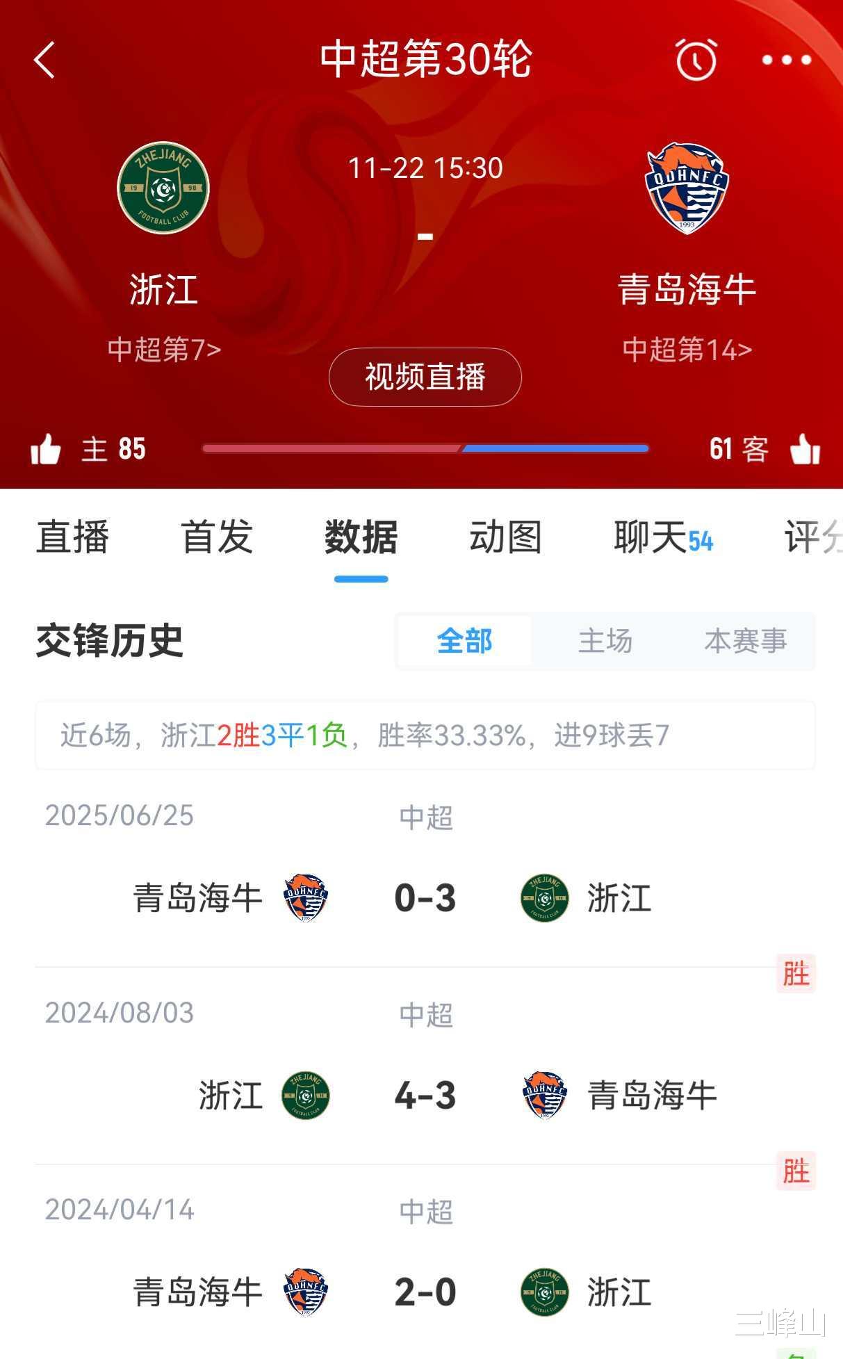 2024、2025两个赛季,青岛和浙江有三场比赛,青岛1胜2负,最后一场有机会。青岛近期有反弹势头,想要保级还得自己努力。