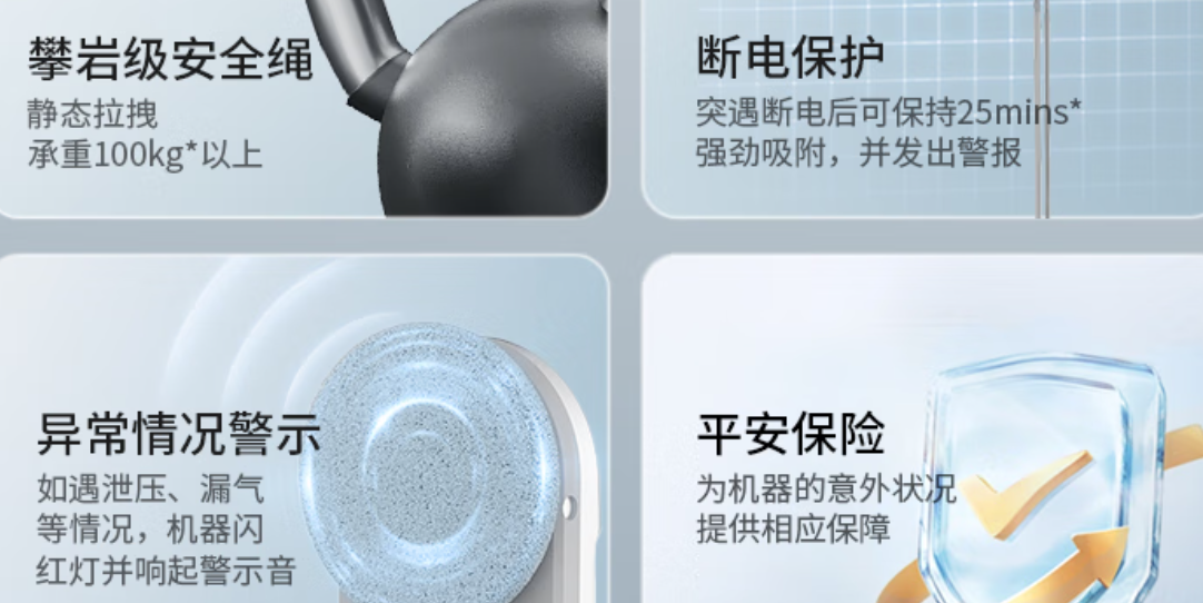 这款基站式擦窗机器人以六合一便携基站重塑使用体验,堪称“移动清洁站”。基站内置5200mAh锂电池,单次可清洁65㎡玻璃,告别插电束缚;5.5米安全绳电源线二合一设计,搭配一键自动收线功能,大窗户清洁无需反复拆绑。清洁力上搭载三喷头广角喷水技术,水压提升100%、喷水量增加133%,配合WIN-SLAM 4.0智能规划系统,提供快速、精细、深度三种模式,沿边清洁模式可精准绕行把手并二次扫边。800N底盘吸附力搭配5.2kg基站配重,60°-120°倾斜玻璃也能紧密贴合。十二重安全守护含百万级商业保险,光耦传感器0.02s极速探边,低矮障碍物可灵活脱困,适配落地窗、小格窗等多场景。
