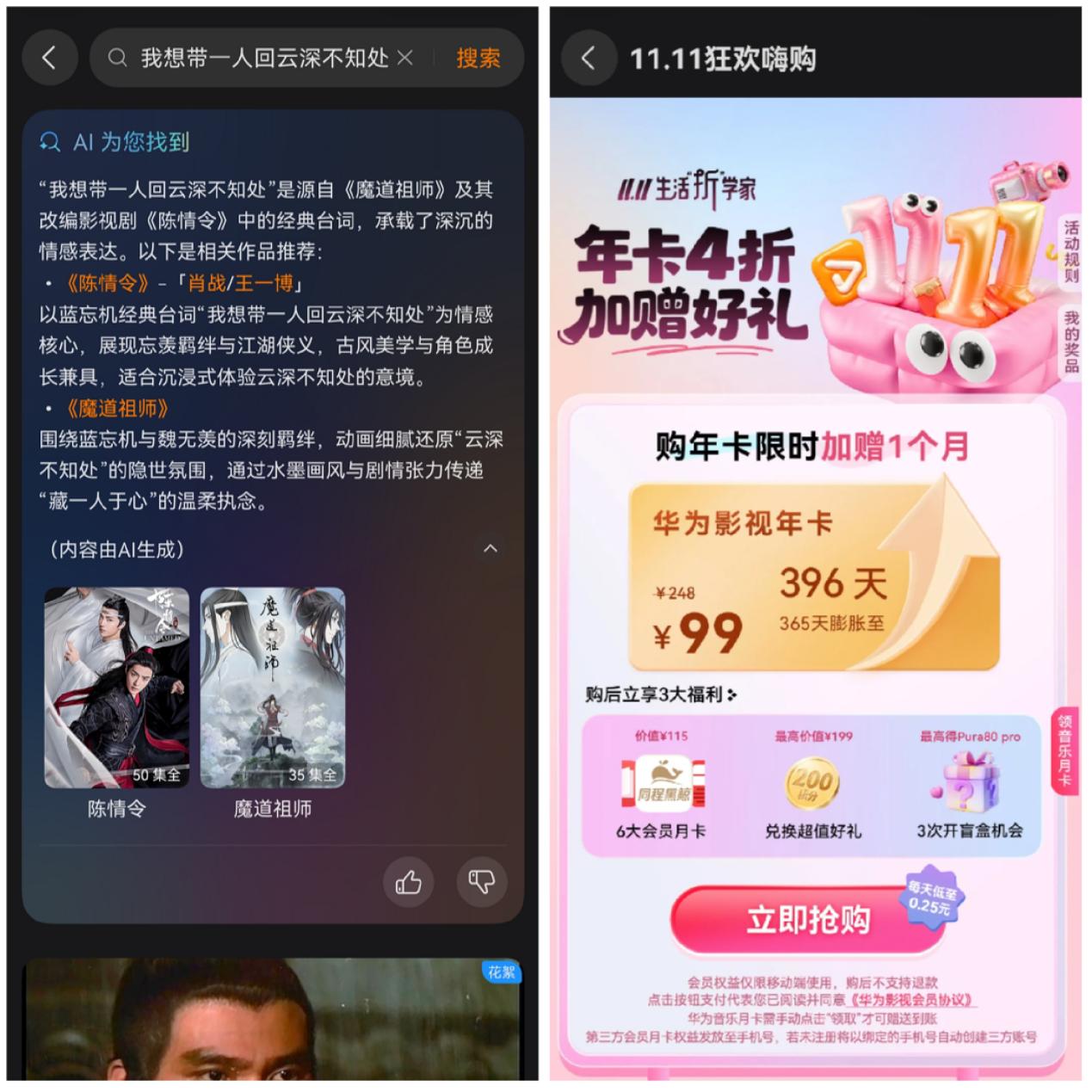 用华为影视年卡追剧有多爽?偶尔想追剧“记不住片名”,华为视频的AI搜功能帮我快速解决困扰。前几天突然想起一句经典台词“我想带一人回云深不知处”,直接在搜索框输入台词,一秒就定位到《陈情令》,比去搜片名再去找片子快多了。最近《南京照相馆》上线网播版本,影视会员可以用AiMax影院画质看大片,连演员脸上的细微表情都能看的一清二楚,堪比影院视听享受。而且双11,影视年卡活动99元到手13个月,算下来每个月才7块多就能畅看海量大片,这不比去电影院省多了?