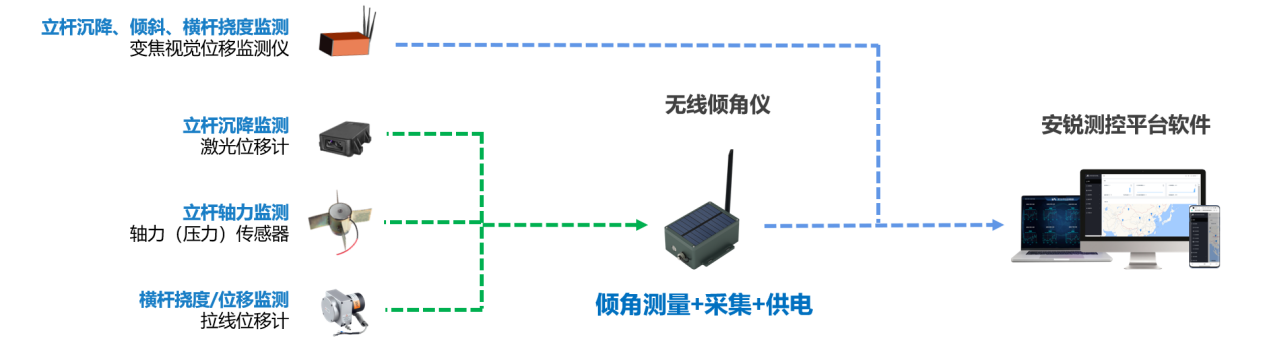 二、高支模在线监测系统概述高支模变形监测预警系统是由前端智能传感器、中端数据采集终端与后端安锐云平台组成的自动化安全监测体系。该系统通过在高支模立杆、横杆、扫地杆等关键部位布设传感器,实时采集模板沉降、横杆挠度、支架倾斜、立杆轴力、模板荷载及环境温度和风速等核心参数,实现对支撑体系受力状态与变形趋势的动态感知。