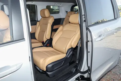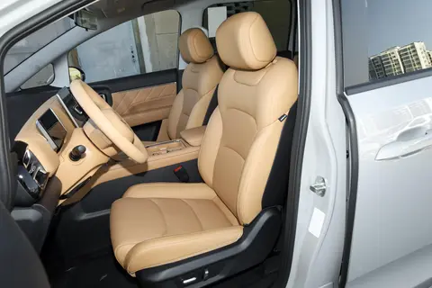 进入车内,2+2+3 的 7 座布局让空间分配十分合理,我们邀请了一位身高 180cm 的体验者进行实测。调整主驾驶座椅至合适位置后,体验者头部距离车顶有一拳两指的余量,腿部距离踏板还有两拳的空间,即使身材较高的驾驶者,长时间驾驶也不会有明显的压抑感。主驾驶座椅支持前后、靠背角度及高低调节,虽然是手动调节,但调节过程顺畅,没有卡顿感,座椅材质为仿皮,表面纹路细腻,触感柔软,座椅的座垫长度适中,能对大腿起到较好的支撑作用,连续驾驶 2.5 小时后,体验者表示腰部没有明显酸痛。第二排独立座椅的设计很贴合家庭使用需求,两侧座椅均配备扶手,扶手高度适中,手肘搭放时自然舒适。体验者坐在第二排,头部距离车顶有一拳的余量,腿部距离前排座椅靠背最多有两拳半的空间,将座椅调至中间位置时,腿部活动自如,甚至能轻松翘起二郎腿。第二排中间过道宽度 230mm,体验者进出第三排时不用侧身,直接正常行走就能通过,对于老人和小孩来说,上下车更加方便安全。值得一提的是,车内配备了全车 41 处声学包 + 32 处吸音棉,我们在实际驾驶中测试发现,当车速达到 90km/h 时,车内噪音主要以轻微的胎噪为主,风噪控制得比较好,家人在后排正常音量聊天完全不受影响,孩子在后排睡觉也不会被噪音吵醒。