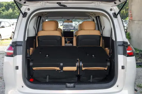 第三排空间表现超出了不少人对 7 座 MPV 的预期,身高 180cm 的体验者坐在第三排,头部距离车顶有一拳的余量,腿部距离第二排座椅靠背有一拳左右的空间,不会有明显的挤迫感,即使连续乘坐 1.5 小时,也不会觉得腿部发麻。第三排座椅支持 4/6 分放倒,放倒后能与后备箱形成一个平整的储物空间,容积达到 1202L,周末带家人露营时,帐篷、折叠桌椅、野餐垫、孩子的玩具箱等物品都能轻松装下,甚至还能放下一个 28 英寸的行李箱。车内还设计了 25 处人性化储物空间,前排中央扶手箱深度约 15cm,能同时放下 6.7 英寸手机、折叠伞和车载充电器;门板储物格能容纳一个 500ml 的保温杯和两包纸巾;后排座椅侧面的储物袋可以放置儿童绘本或平板电脑,方便孩子在乘车时取用,这些细节设计让日常使用更加便捷。