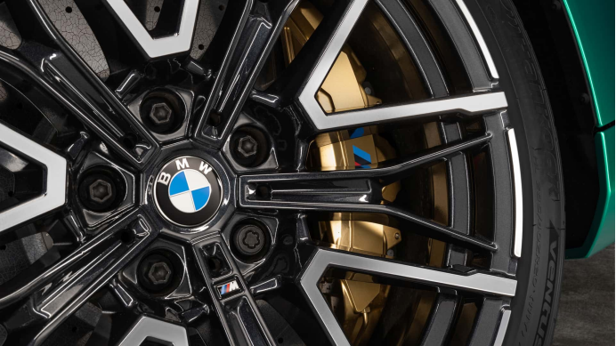 制动部分,新M5标配前六活塞固定式卡钳,后单活塞浮动式卡钳并带有电子手刹功能,前刹车碟尺寸为408mm,后刹车碟为398mm。另外还可以选配碳陶瓷刹车套件,选装了该套件的刹车卡钳会被喷涂成香槟金色,另外前碳陶刹车碟的尺寸也会增加至419mm,比标配的钢碟增大了11mm的直径,重量也会比钢碟刹车碟组减轻55kg,要知道这可是非簧载质量的55kg。