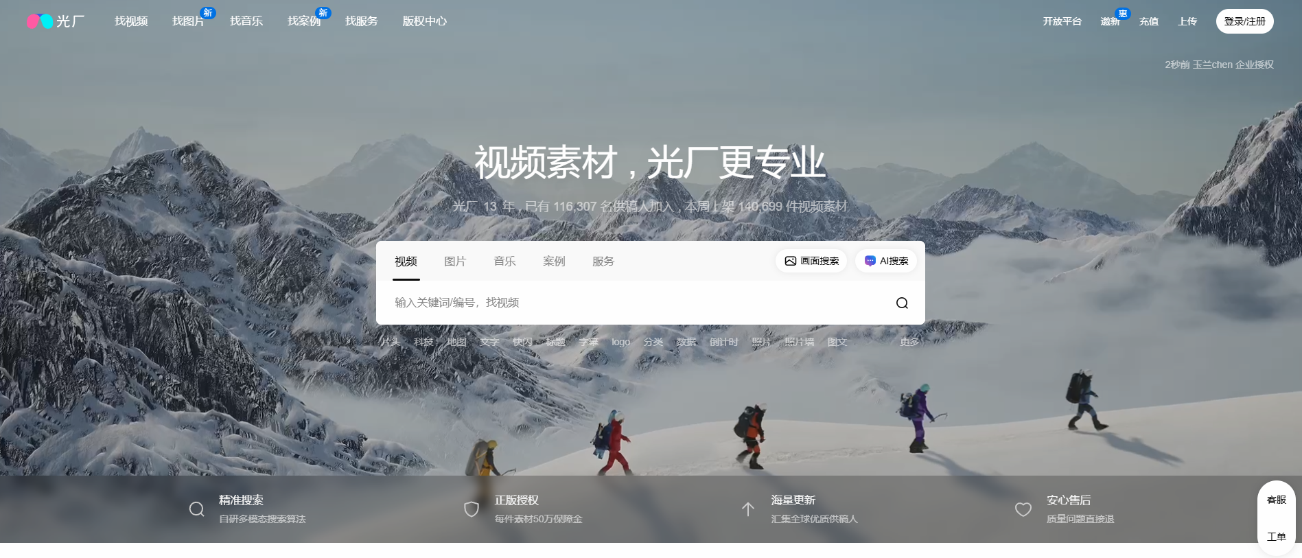 光厂作为国内数字创意作品交易服务领域的佼佼者,创立于 2012 年。经过多年深耕,已汇聚超百万名供稿人,站内在售素材超 3000万件,涵盖人文自然、城市风光、活动庆典等丰富多样的场景,在视频素材交易领域占据重要地位。