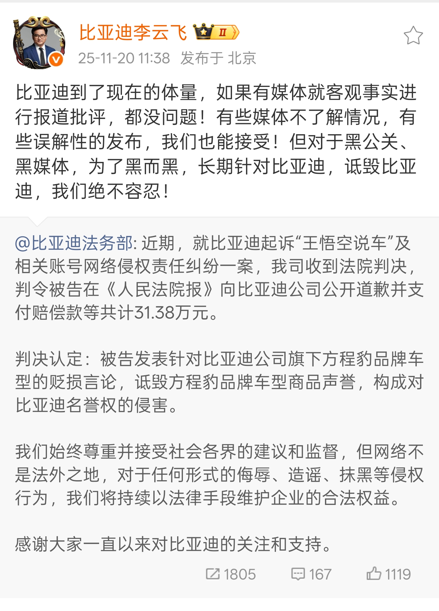 就像比亚迪云飞总说的,不了解情况发了误解性内容能理解,但那种“为了黑而黑”,天天盯着企业诋毁的,真没法忍。从悬赏打击黑公关到接连起诉胜诉,不管是赔200多万的“龙猪-集车”,还是这次的案子,都在明明白白说,比亚迪已经采取行动反击,对于黑公关绝不容忍