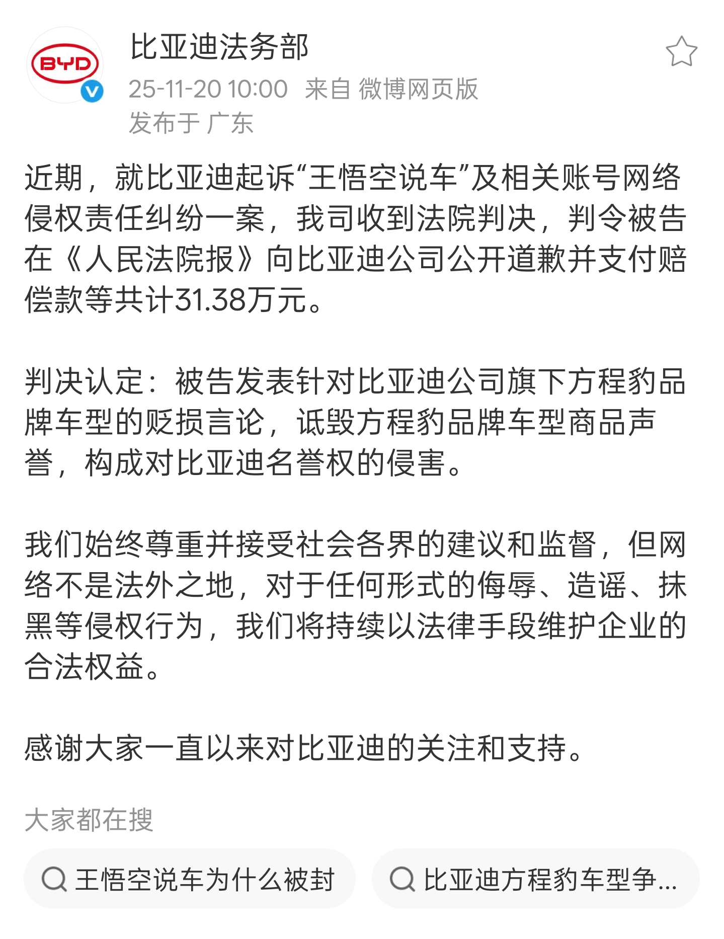 比亚迪赢了“王悟空说车”的侵权官司,判决被告需向比亚迪公开赔礼道,并赔偿31万多,这事儿看得真解气!现在有些自媒体太离谱了,为了流量就随便抹黑车企、乱喷车型,说些没根据的贬损话,这哪儿是评车啊,分明是恶意搞事,既坑了想买车的消费者,还把行业风气搅得乌烟瘴气