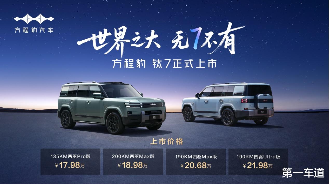 10月14日,“方程豹钛7媒体动态品鉴会暨交付仪式”活动在石家庄滹沱河露营场地举办,众多区域媒体及钛7车主齐聚现场,共同见证“科技大空间SUV”钛7的区域亮相。新车推出135KM两驱Pro版、200KM两驱Max版、190KM四驱Max版、190KM四驱Ultra版等4款配置,价格区间17.98万元-21.98万元,以硬派基因与全能实力重塑都市家庭出行新标杆。