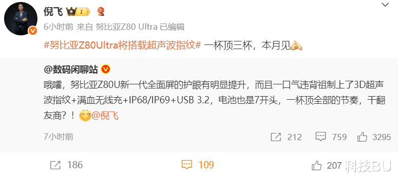 对此爆料,中兴通讯终端事业部总裁、努比亚技术有限公司总裁倪飞进行了转发与确认,他称努比亚Z80Ultra将搭载超声波指纹,一杯顶三杯,本月见。
