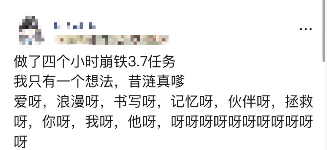 换个角度看,在内卷严重的二游市场里,各家厂商都忙着卷立绘、卷剧情、卷世界观、卷运营……像昔涟这样花费几十个小时的版本内容塑造、投入最高规格制作资源的角色,放眼二游市场里是非常大胆的。这次3.7版本更新尝试引发的社区讨论、达成的营收成绩,无疑是《崩铁》未来内容创作和持续运营的一次经验累积。