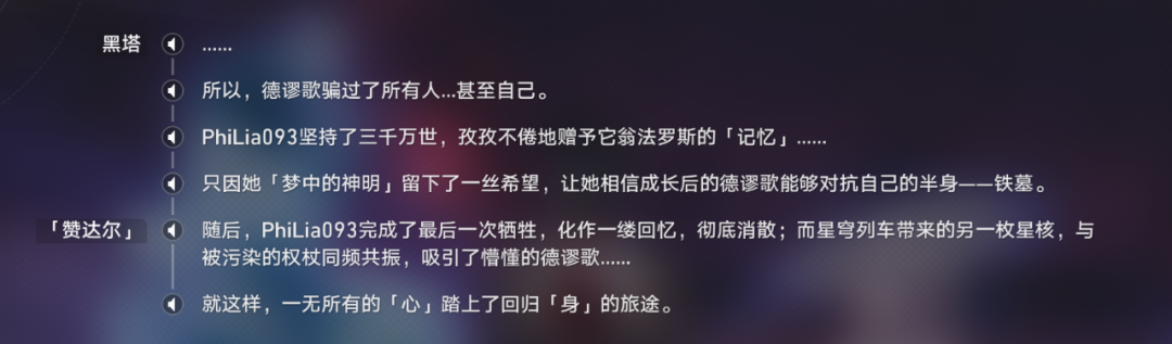 3.7版本里关于昔涟部分最出彩的莫过于,三千万世轮回里每一代小昔涟共同努力,让德谬歌一点点成为昔涟的段落,这一段不仅是厘清长久困惑大家的迷迷、昔涟及德谬歌三者关系,更让玩家明白那个爱笑、充满热爱的昔涟实则也是脆弱的、会感到悲伤,她不懂爱又渴望了解什么是爱、如何去爱。
