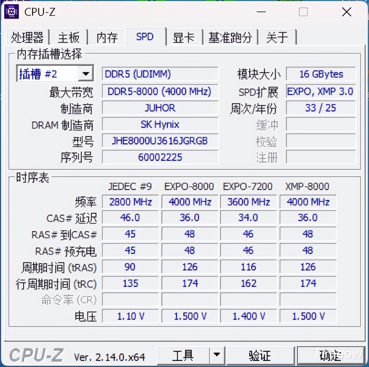 先看看CPU-Z认证:DRAM制造商为海力士,支持XMP 3.0和EXPO双平台一键超频,包含三套SPD预设,如果你的主板CPU体质不够强力的话,可以选择低一档的EXPO-7200,兼容性拉满了属于是,最高档8000MT/s的预设时序为36-48-48-126。
