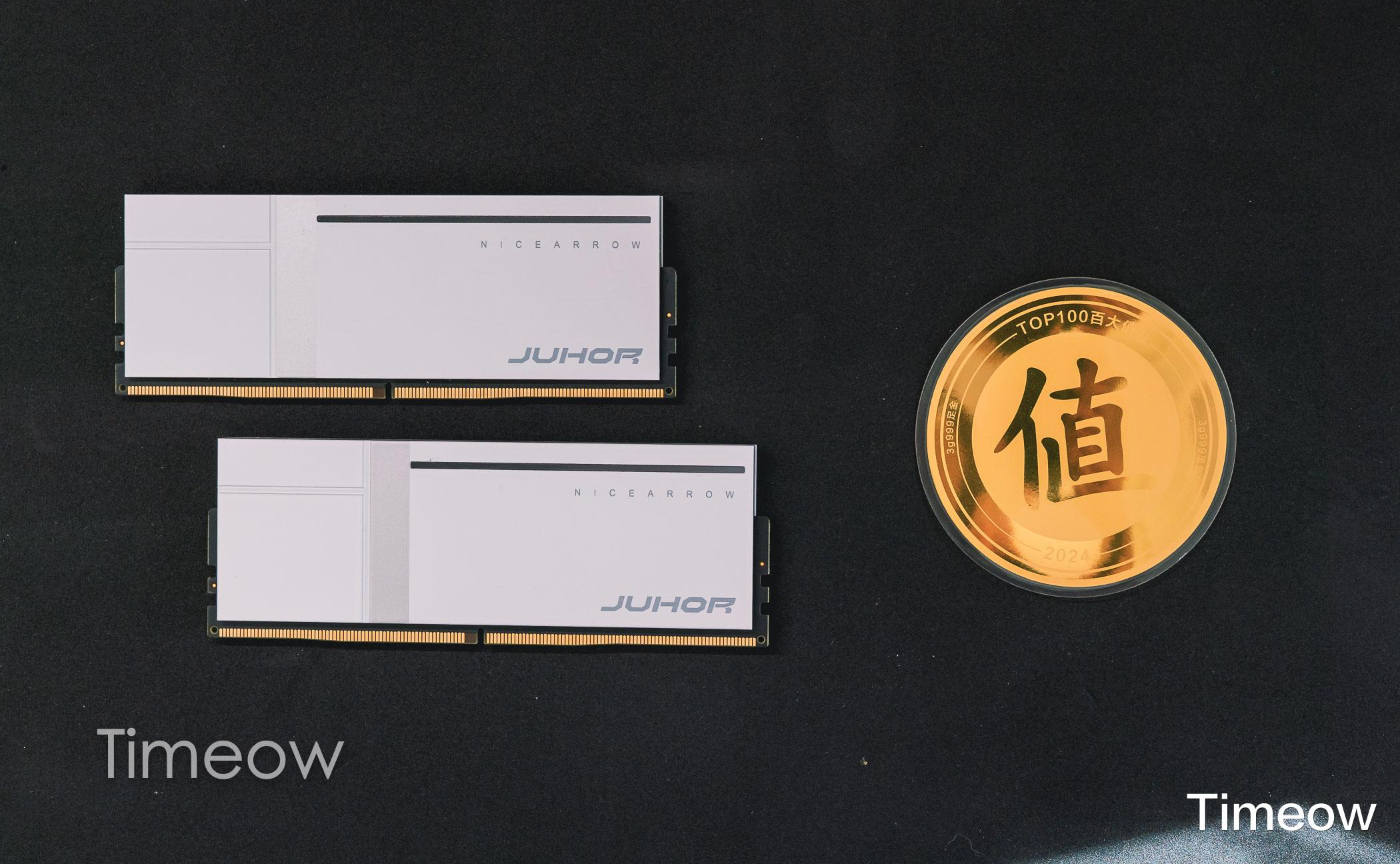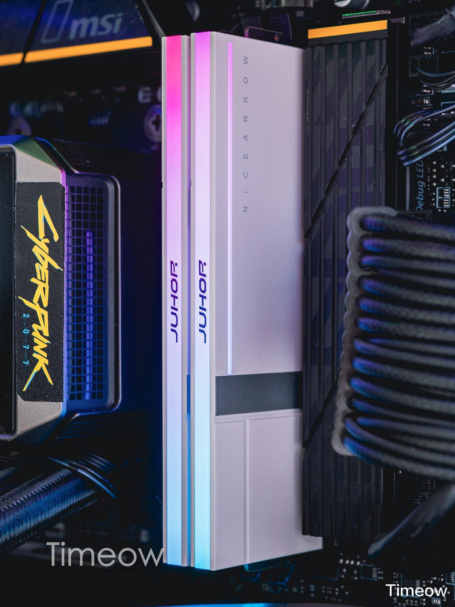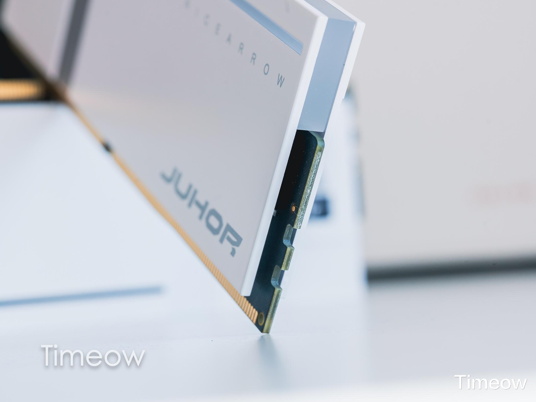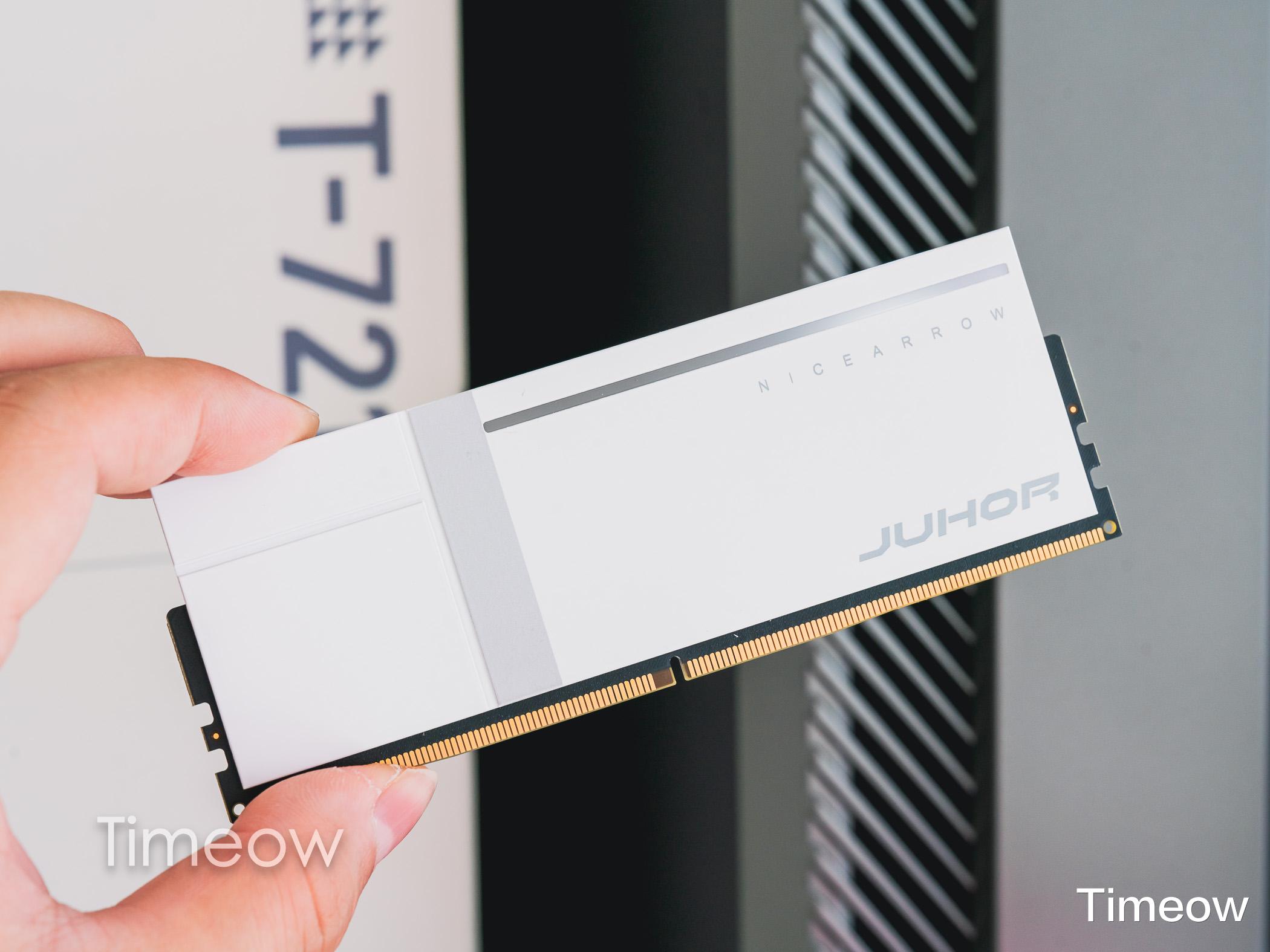 内存本体采用纯白色哑光金属马甲,触感细腻、质感不俗。设计上融入了异刃概念,凌厉的T字凹槽与银灰色装饰区块构成破空之刃的意象,颜值相当能打。