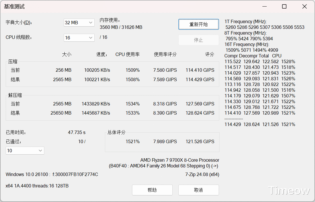 在生产力测试中,7-ZIP基准测试得分121.526 GIPS,按理说这算是很强了,远超绝大多数的办公电脑和笔记本。