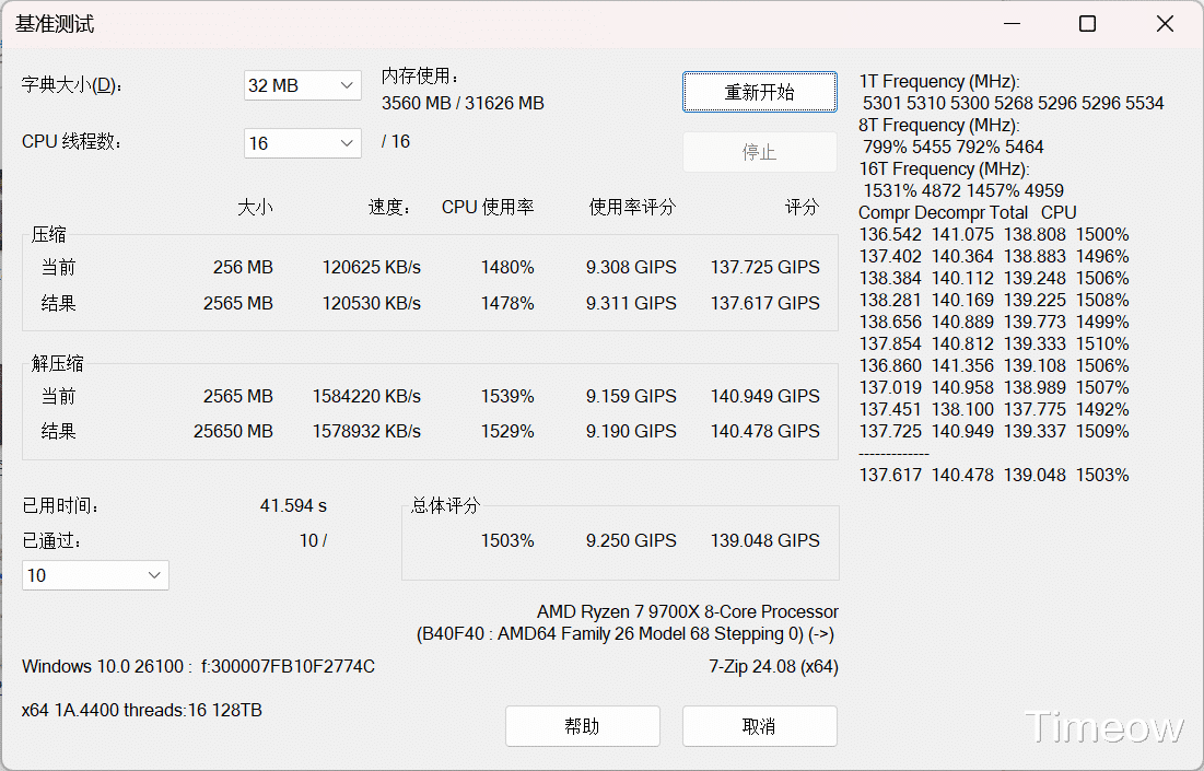 7-ZIP基准测试中,内存开到8000MT/s后得分来到了139.048 GIPS,相比7200MT/s,整机生产力性能小幅提升。