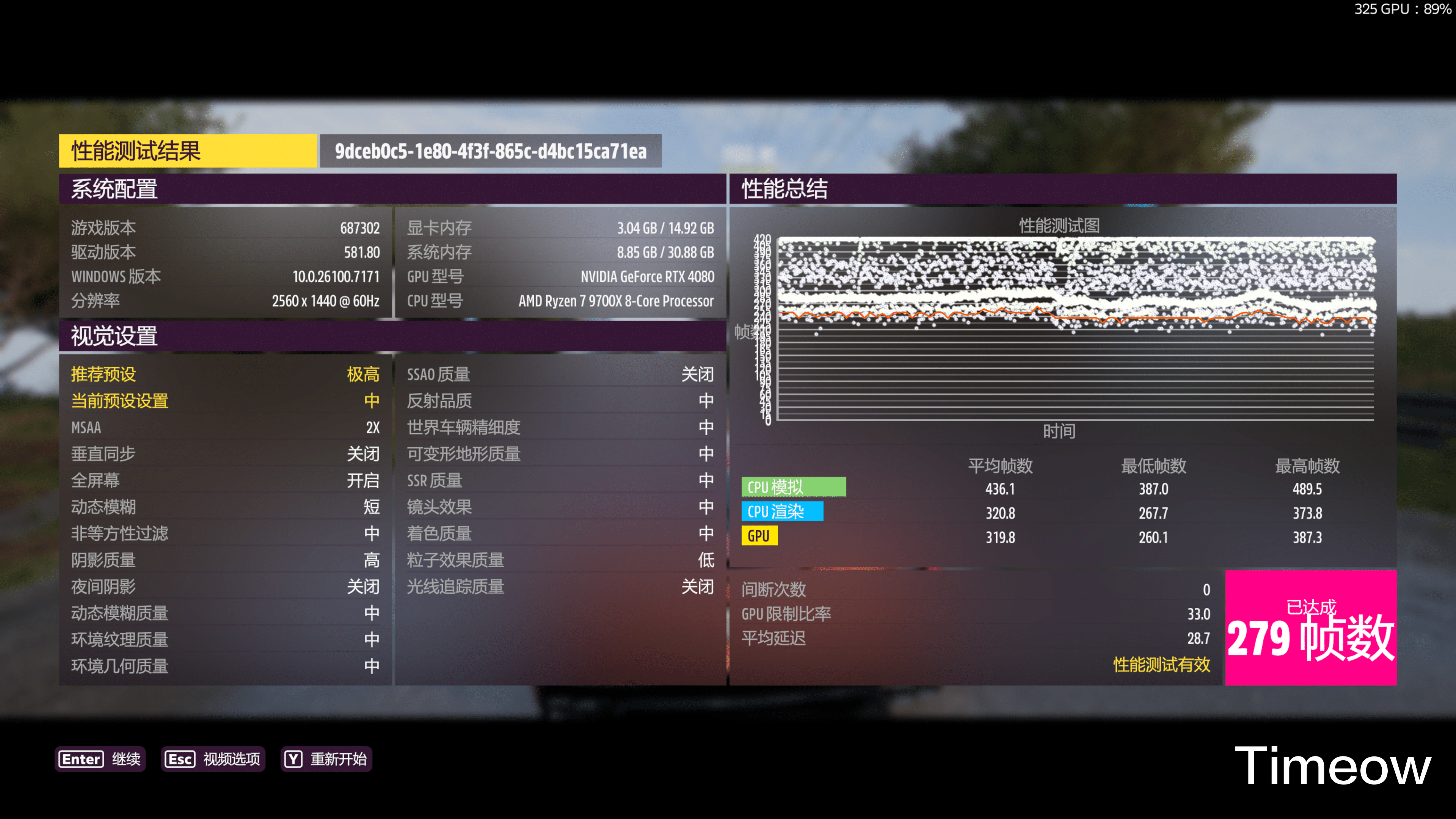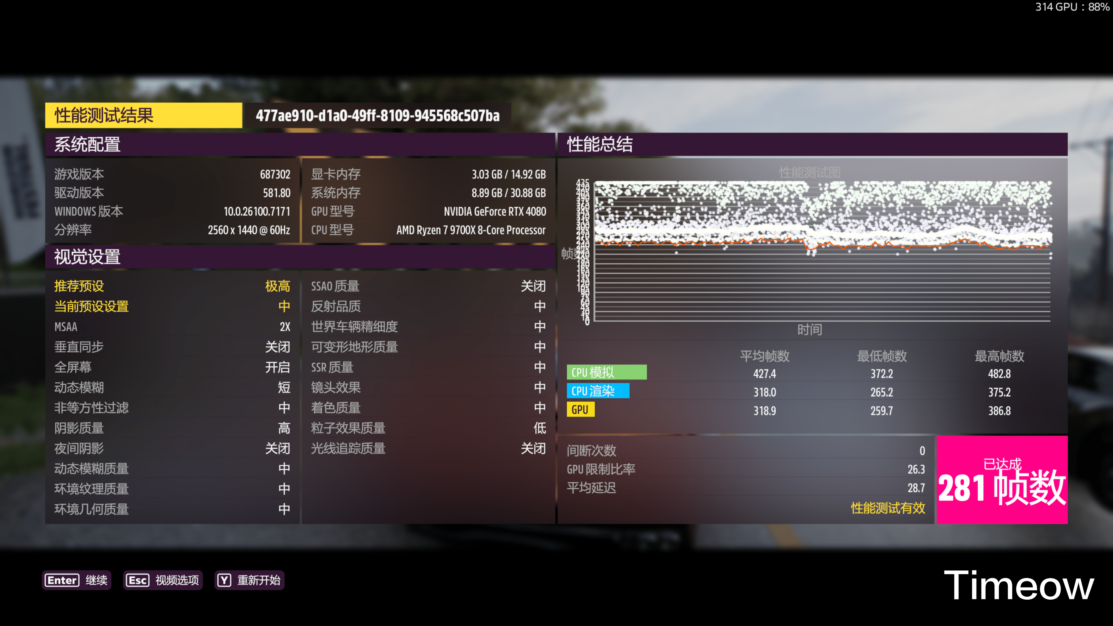 《极限竞速地平线5》同等画质下,CPU平均帧427、最低帧372,提升也达到了20%以上。不过由于受显卡性能限制,最终达成了281帧数,在显示器上呈现的结果并没有那么高。