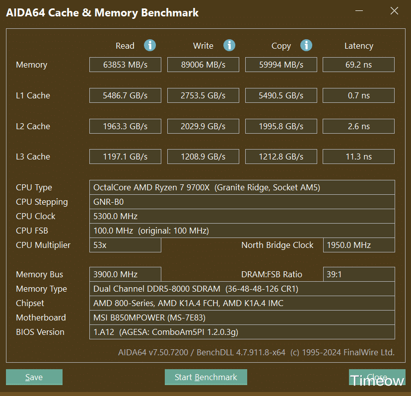 AIDA64内存测试中,读取、写入、复制分别约为63.8GB/s、89GB/s、60GB/s,延迟69.2ns,性能和延迟也同样优秀,不过相比7200MT/s,数据好像没有什么区别、甚至有点倒吸。但别急,接着看: