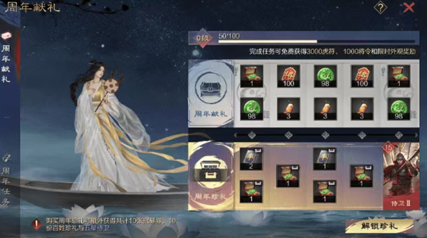 像是上面承诺的4800虎符,玩家单纯参加以战令形式推出的“周年献礼”活动,就能在免费路线稳拿3000。而且这个周年献礼不仅路线短、任务简单,要是做完之后,还能从最后的“百姓珍礼”里面再爆1022虎符。