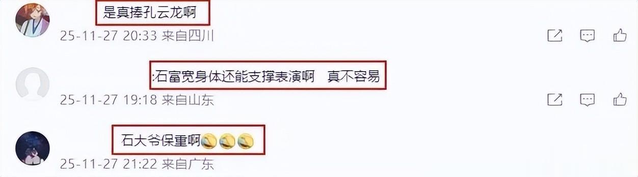 鉴于孔云龙去年的表现,网友也是有担心的。像三哥这么能真活,这么有特点,师爷石富宽能扛得住吗?会不会疯。也有的感慨,石富宽这么大年纪了,还能支撑表演,真不容。更多的,则是希望去年快乐的延续,希望石富宽保重身体的情况下,将快乐最大化体现出来。