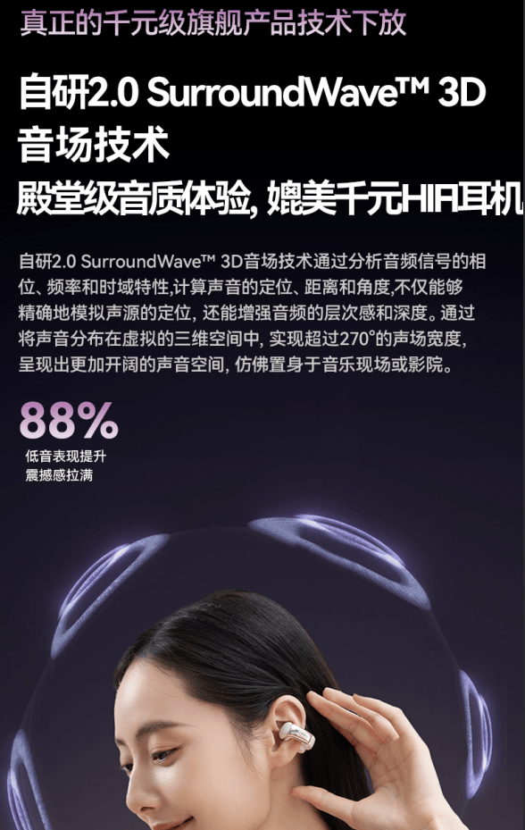 另外,Plume 内置自研2.0 SurroundWave™ 3D 音场技术,通过对音频信号相位、频率与时域特性的深度分析,动态计算声源定位、距离与角度,构建超过270°的虚拟三维声场,显著增强音频层次感与纵深感,听感更接近现场或影院级体验,并在低频表现上带来高达88%的提升,场面感与冲击力直接拉满!