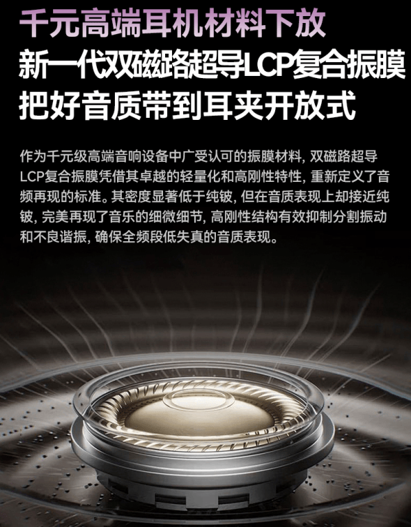 Plume将千元级高端单元与振膜技术首次引入耳夹式形态,核心配置包括 新一代双磁路超导LCP复合振膜 与 12mm永磁极音频单元。该振膜兼具轻量化与高刚性特性,在解析力和失真控制方面已接近纯铍水准,能够精准还原音乐细节,有效抑制分割振动与不良谐振,确保全频段实现低失真输出。