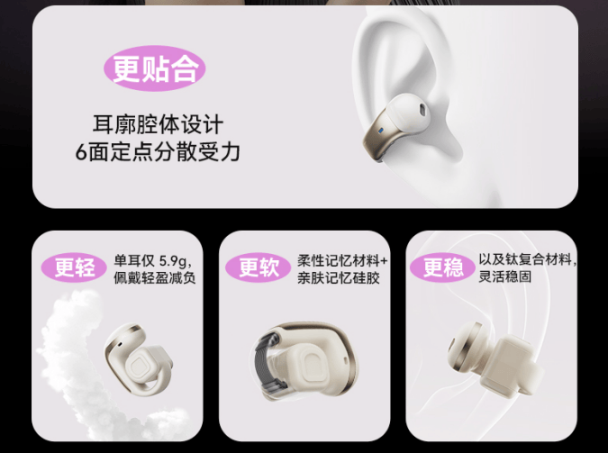 在材料与重量控制上,Plume单耳仅5.9g,轻盈几乎无感。其耳机与耳廓接触部分采用 柔性记忆材料与亲肤记忆硅胶,带来极致柔软与透气体验,同时辅以 钛基复合材料,在轻量化与结构强度之间实现完美平衡。独特的 六面定点分力耳廓腔体设计,能均匀分散压力,使佩戴更加稳固贴合,无论长时间办公、日常通勤,还是高强度运动,都能始终保持稳如初始。