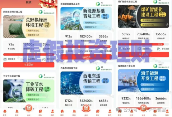 话术:自称“国家绿色发展基金平台”,提供收益率高得离谱的理财产品。