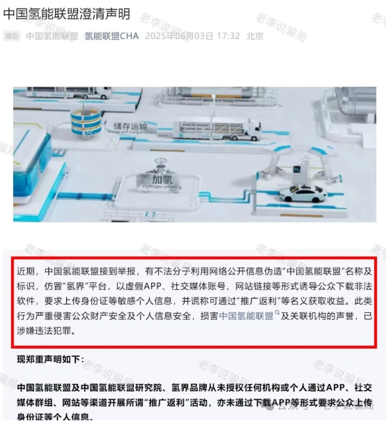 真相:正牌“中国氢能联盟”已发布声明,并已向公安机关报案。该APP只能通过第三方链接下载,提示未备案。