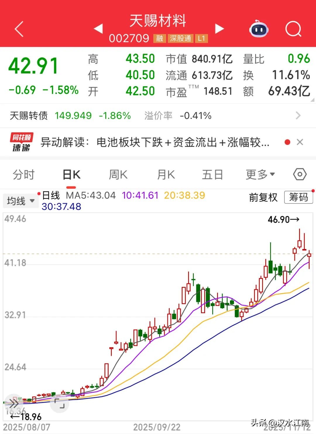 天赐材料股价也从8月份的20元/股涨至11月12日的42.91元/股,总市值840.91亿元。该公司六氟磷酸锂产能为11万吨/年(液态为主),全球市占率37%,稳居行业第一,其电解液自供率超过95%。