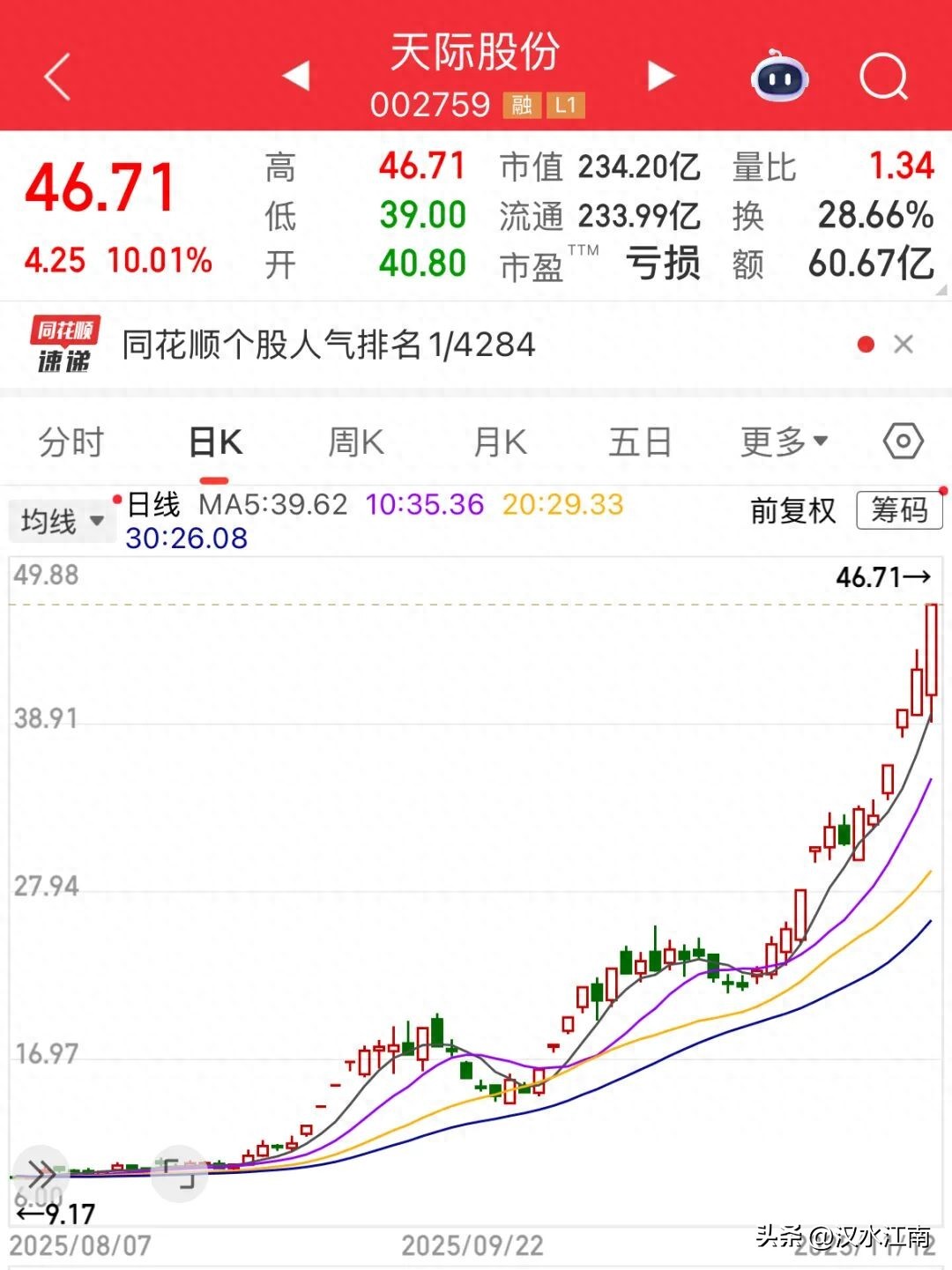 11月12日,天际股份股价报收46.71元/股,再度涨停。该公司股价在8月底时还不足10元/股,如今连番涨停板下,已经逼近50元/股,市值234亿元,年内累计涨幅超过300%,这是何等的疯狂。更不可思议的是,天际股份的六氟磷酸锂产能并不是最多,年产能3.7万吨/年(晶体法),只能排到行业第三而已。