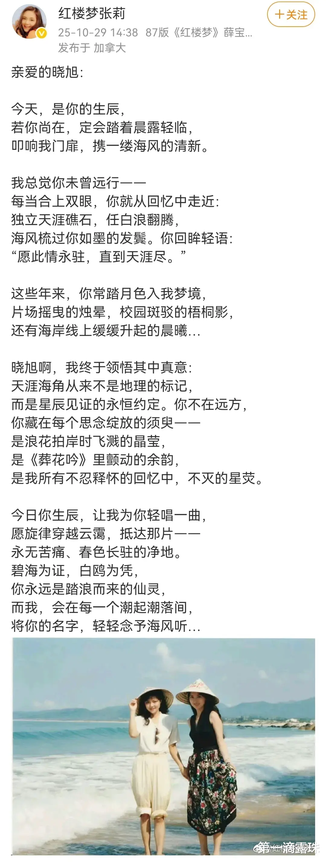 10月29日,87版《红楼梦》薛宝钗的扮演者张莉,在社交平台发布长诗《亲爱的晓旭》,悼念好友陈晓旭,“碧海为证,白鸥为凭”的字句间,满是对故友的思念。